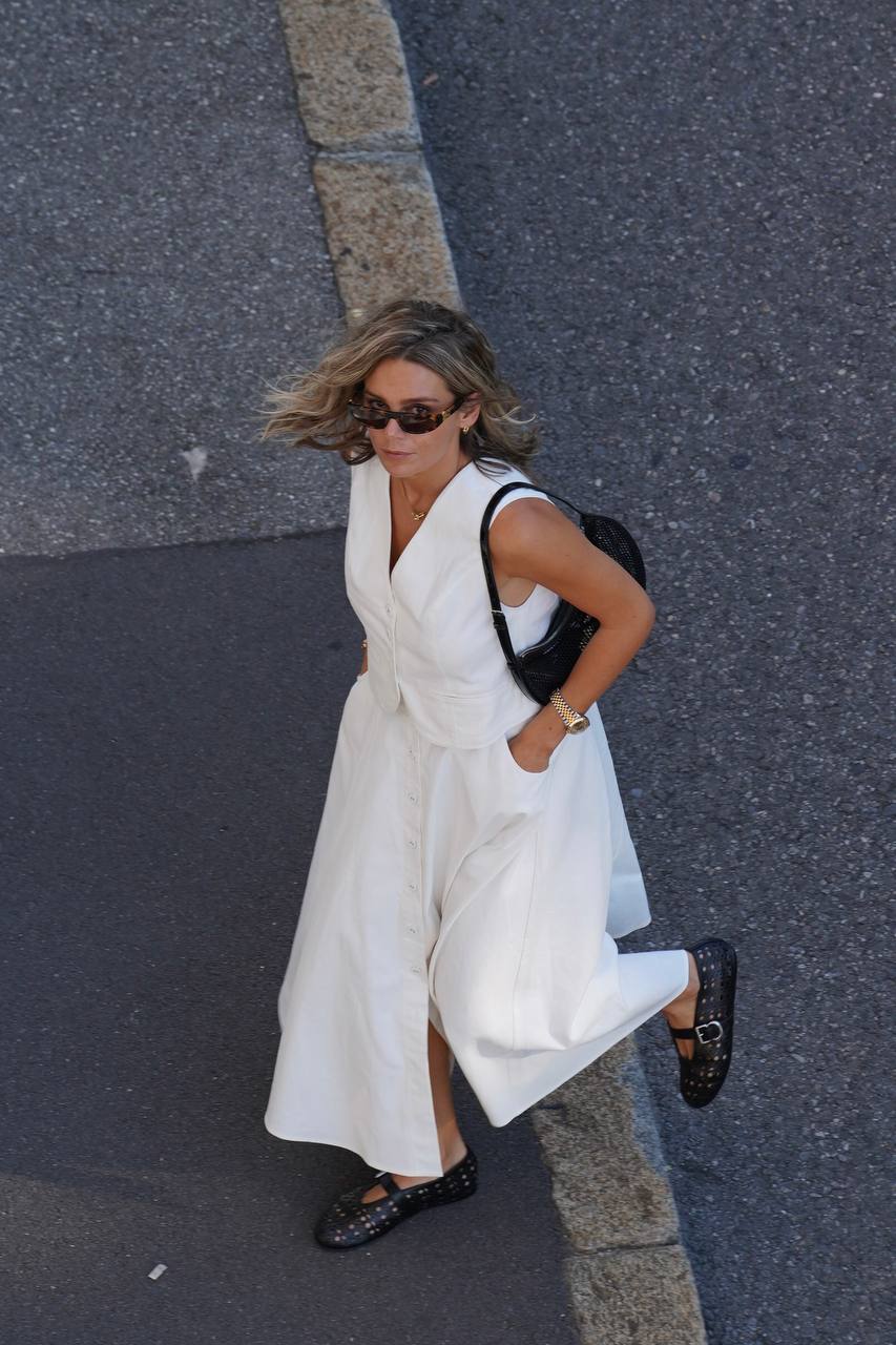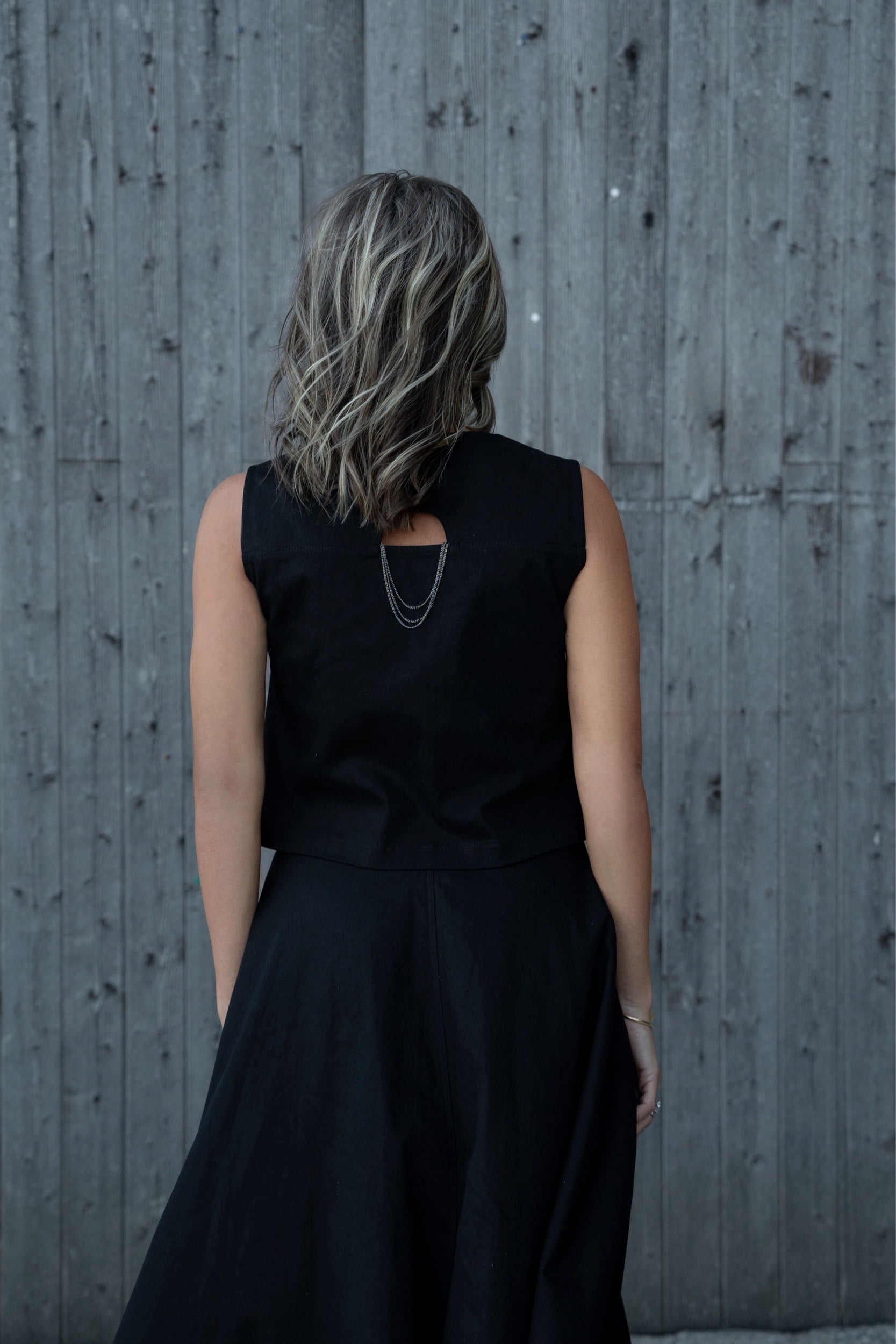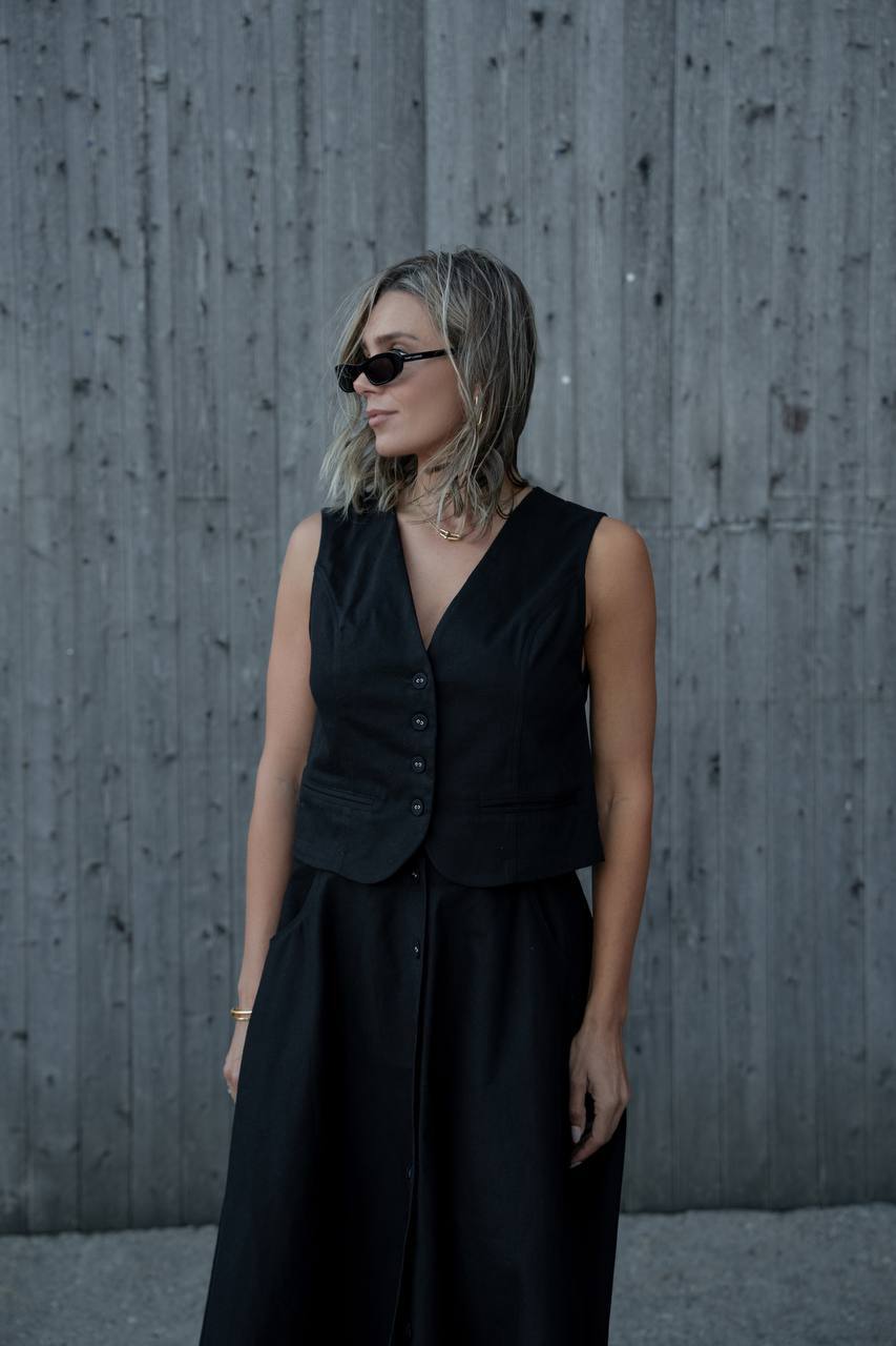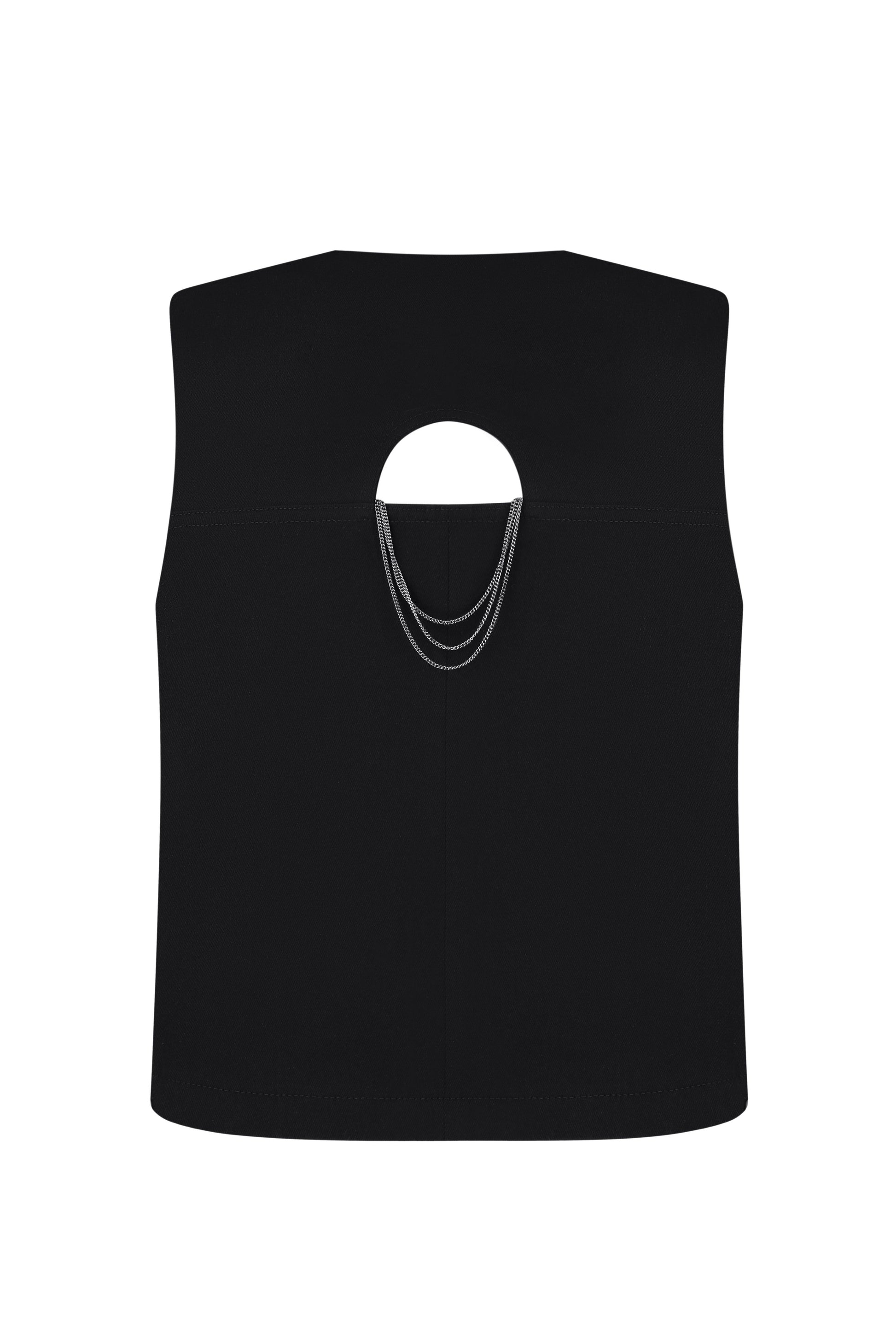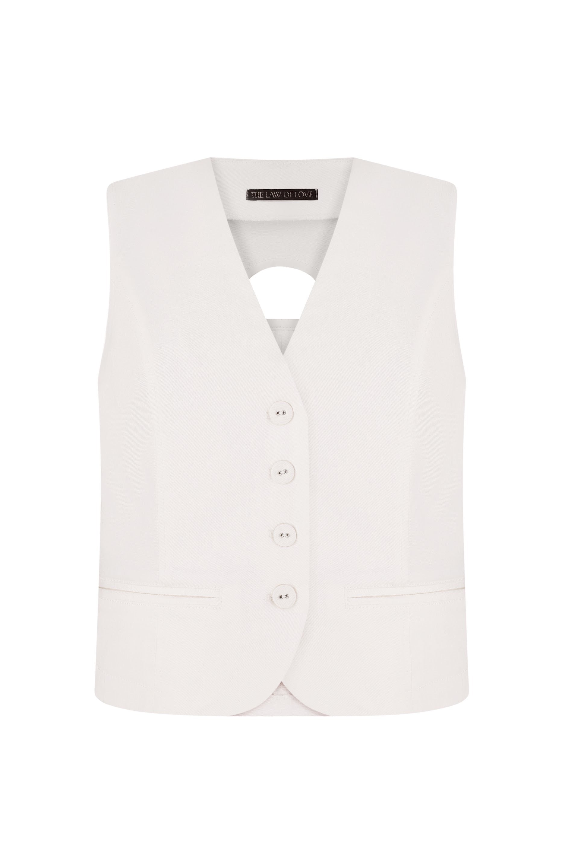 Vest in soft denim with a deep V-neck, rounded front edges and a button closure, two shallow front pockets and a unique decorative detail on the back. It is suggested to be worn on a naked body, as an independent top, and also goes well with a shirt, long sleeve, trousers, skirts and shorts.