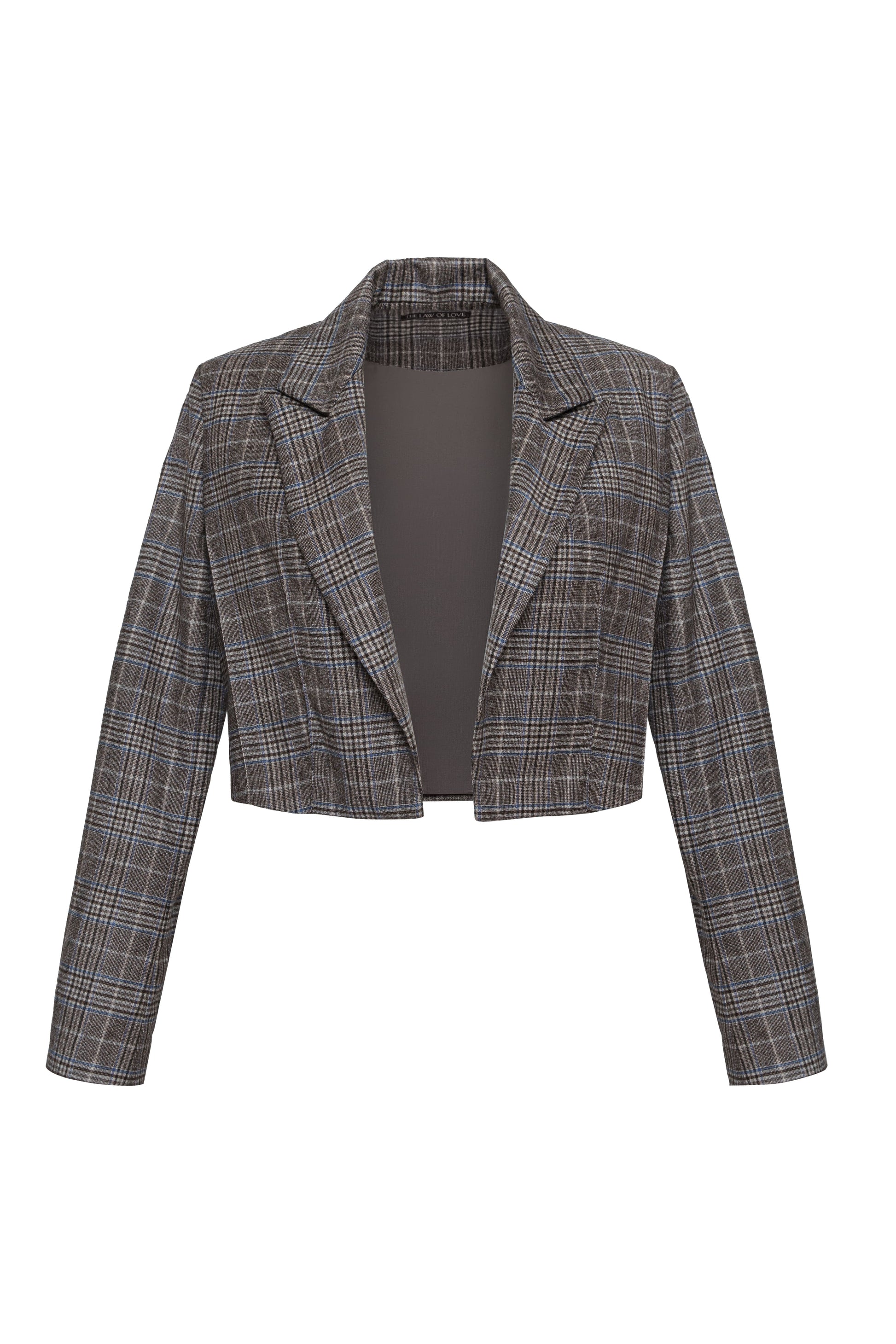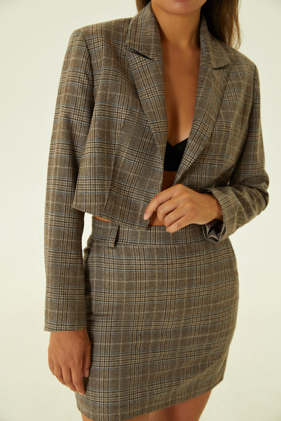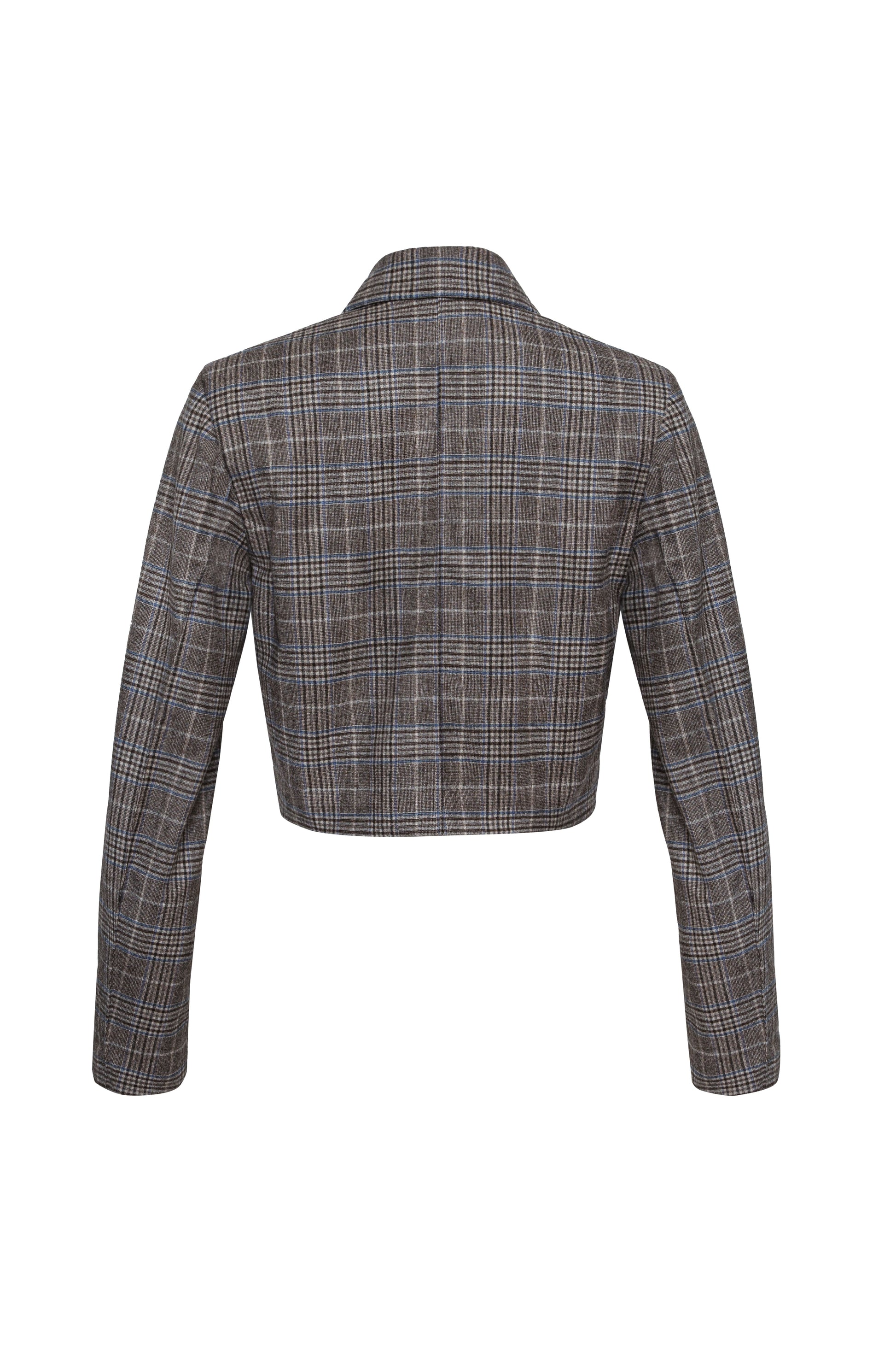 Kurze Jacke aus braun und blau karierter Wolle mit Ziernähten.