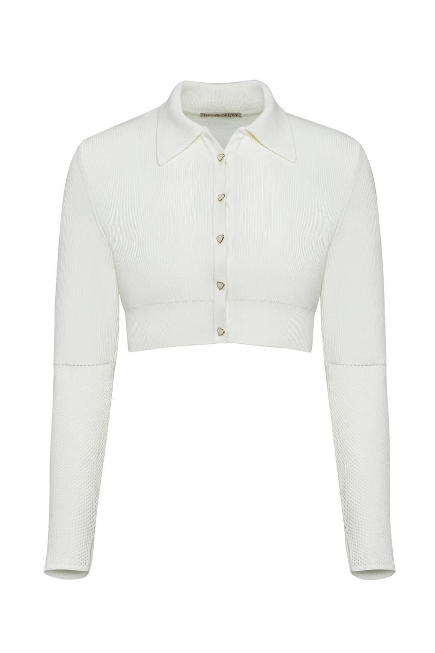 Kurz geschnittenes Top mit Mesh-Ärmeln, natürlichen Baumwollfäden, mit italienischen Knöpfen in Herzform.
