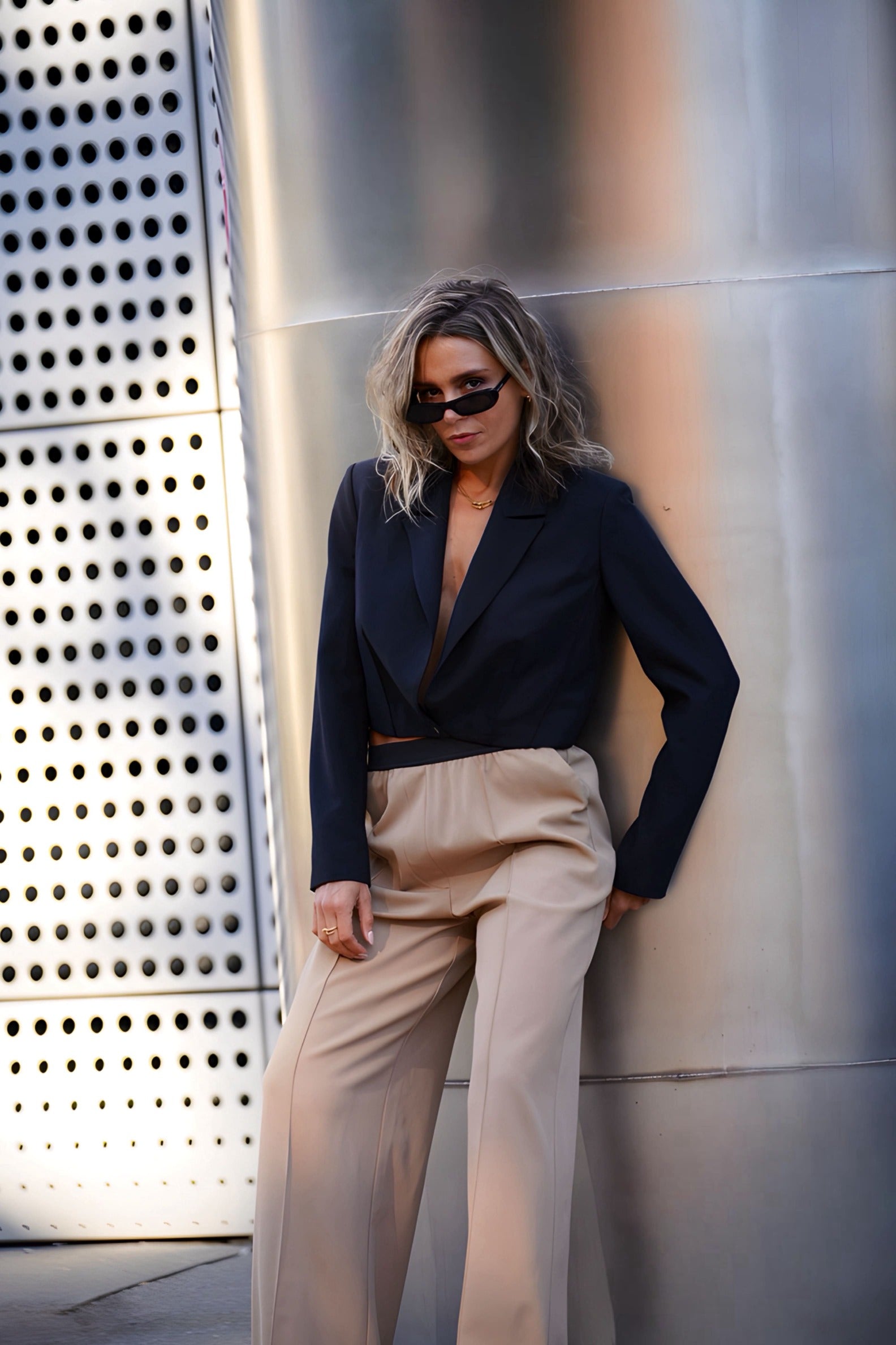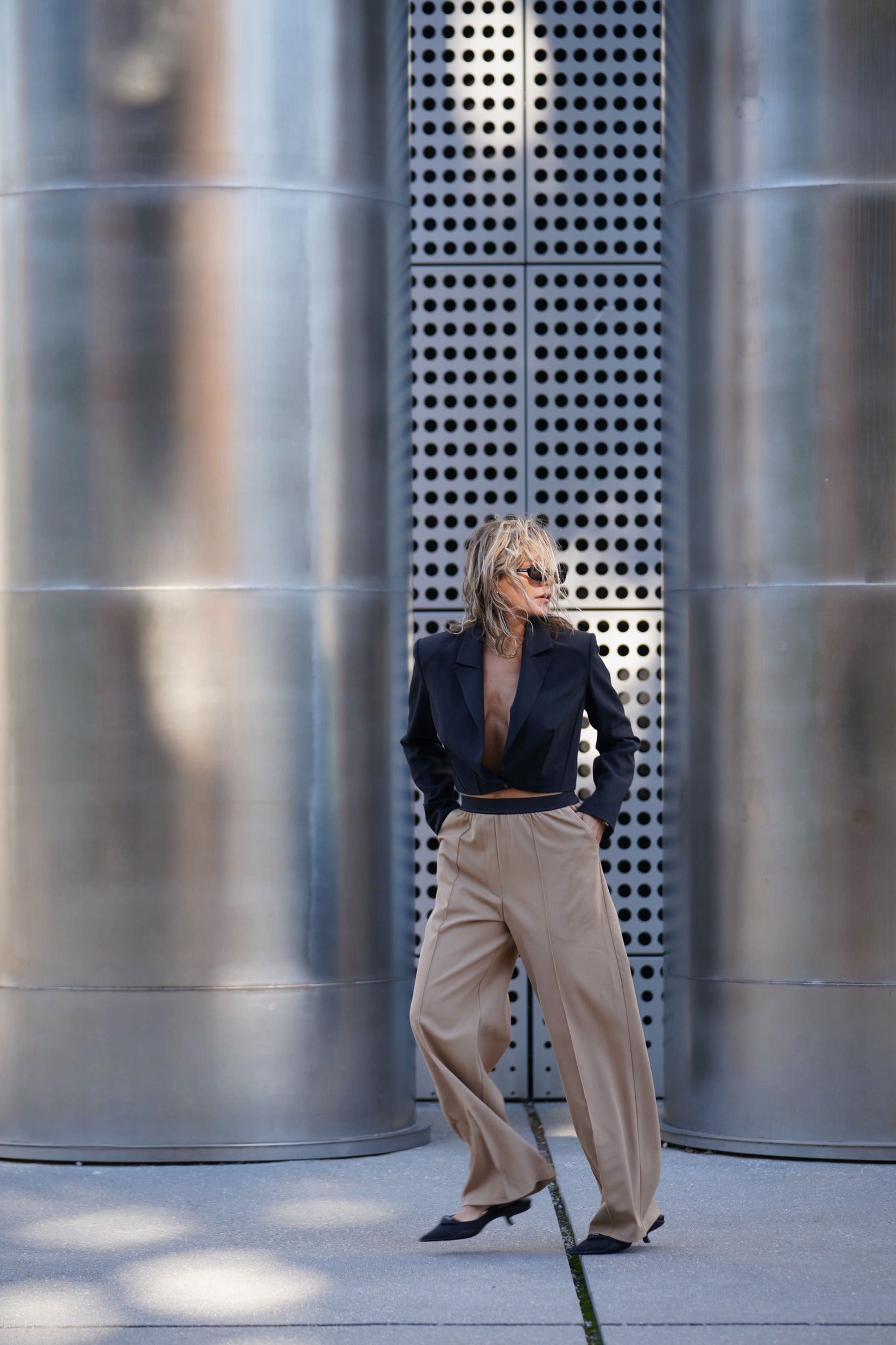 A short, single-breasted, loose-fitting jacket with decorative stitched arrows on the sleeves, front and back, secured with one button. Styles well with trousers, skirts and jeans.