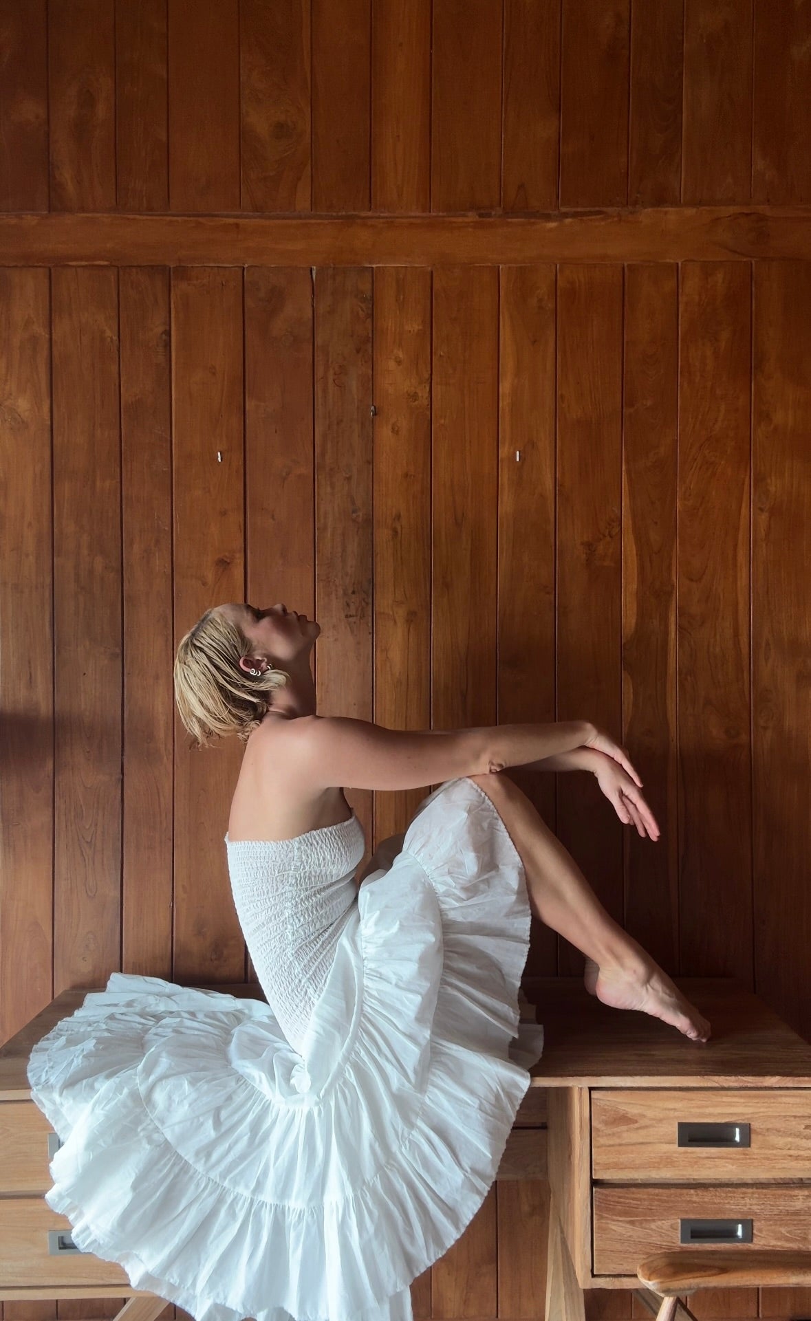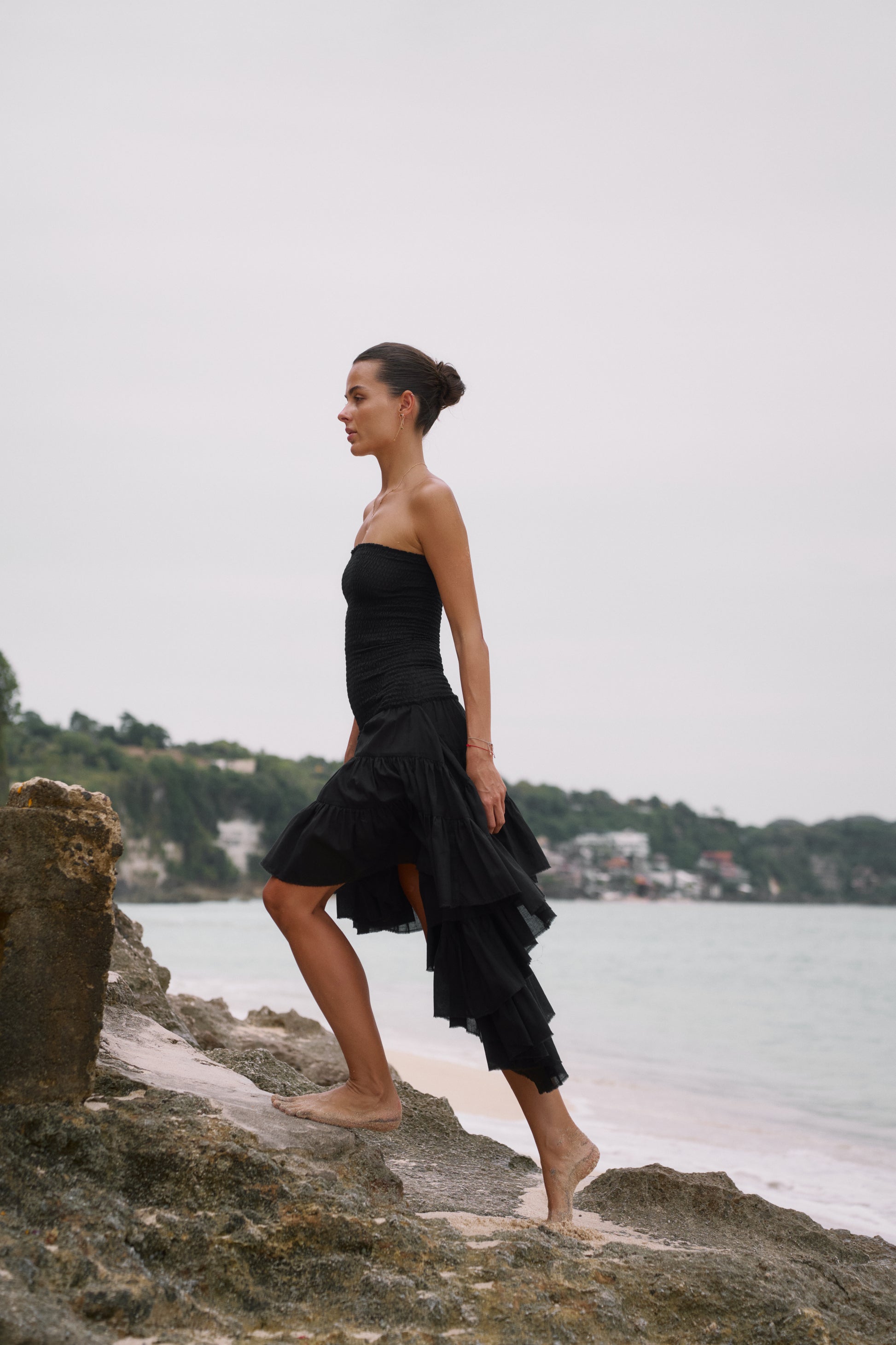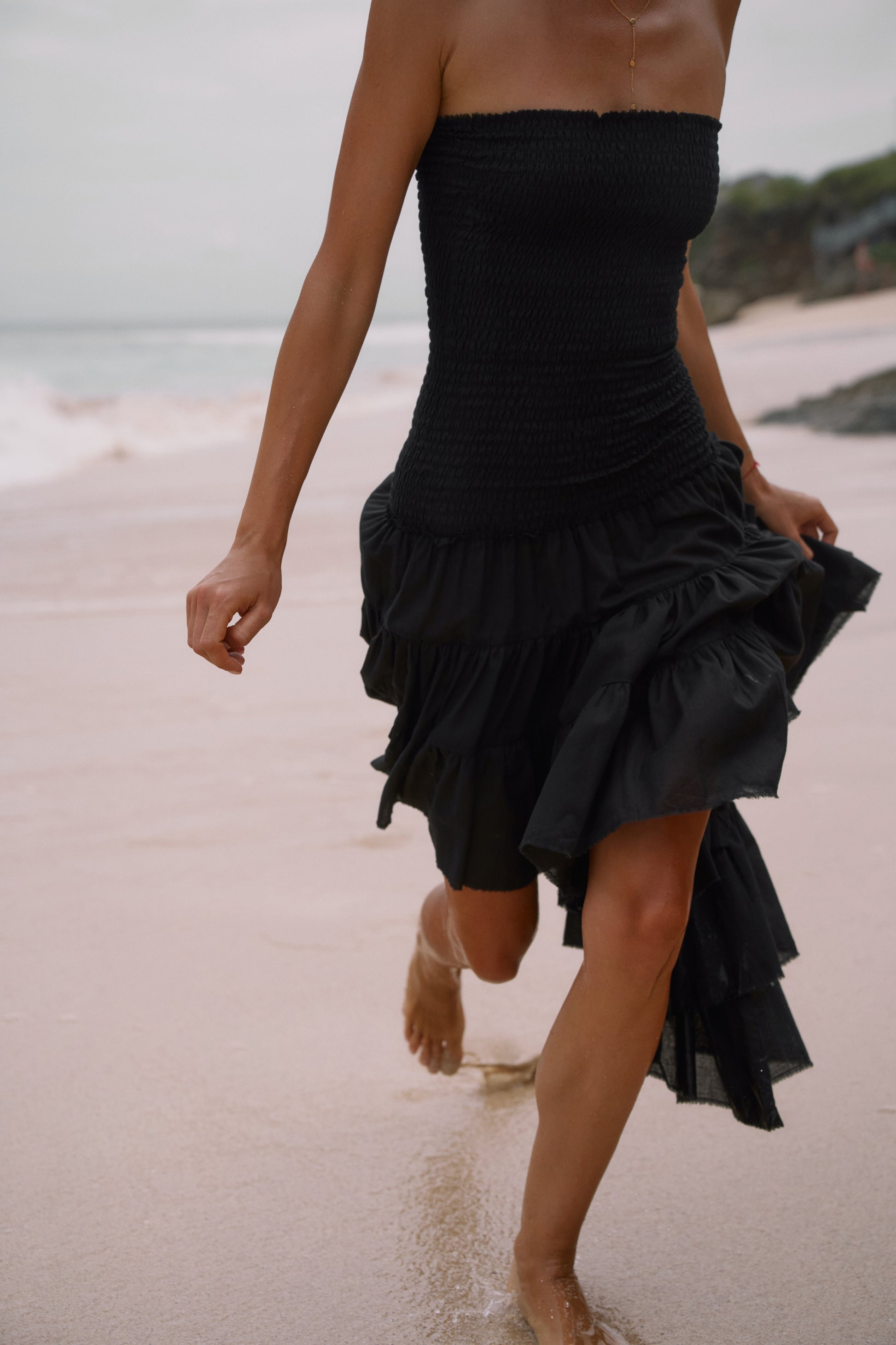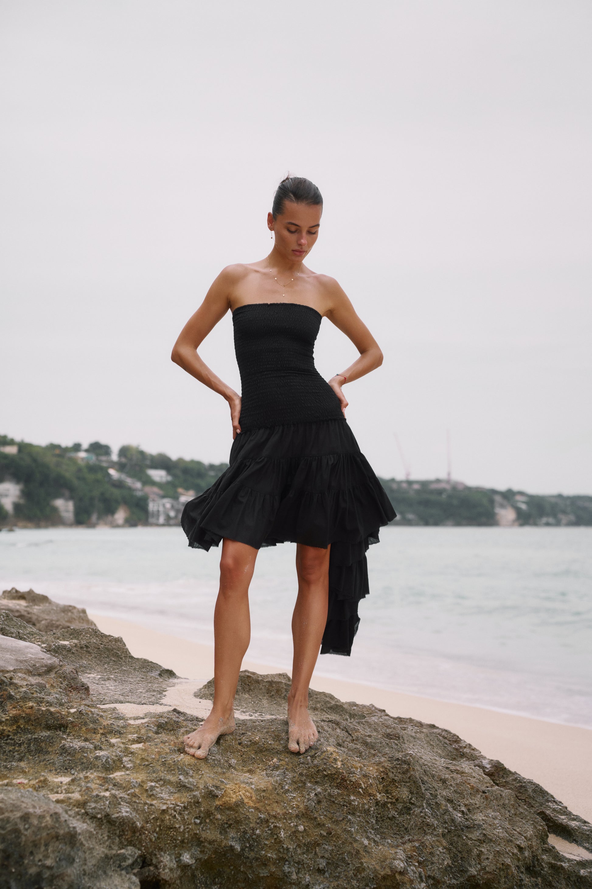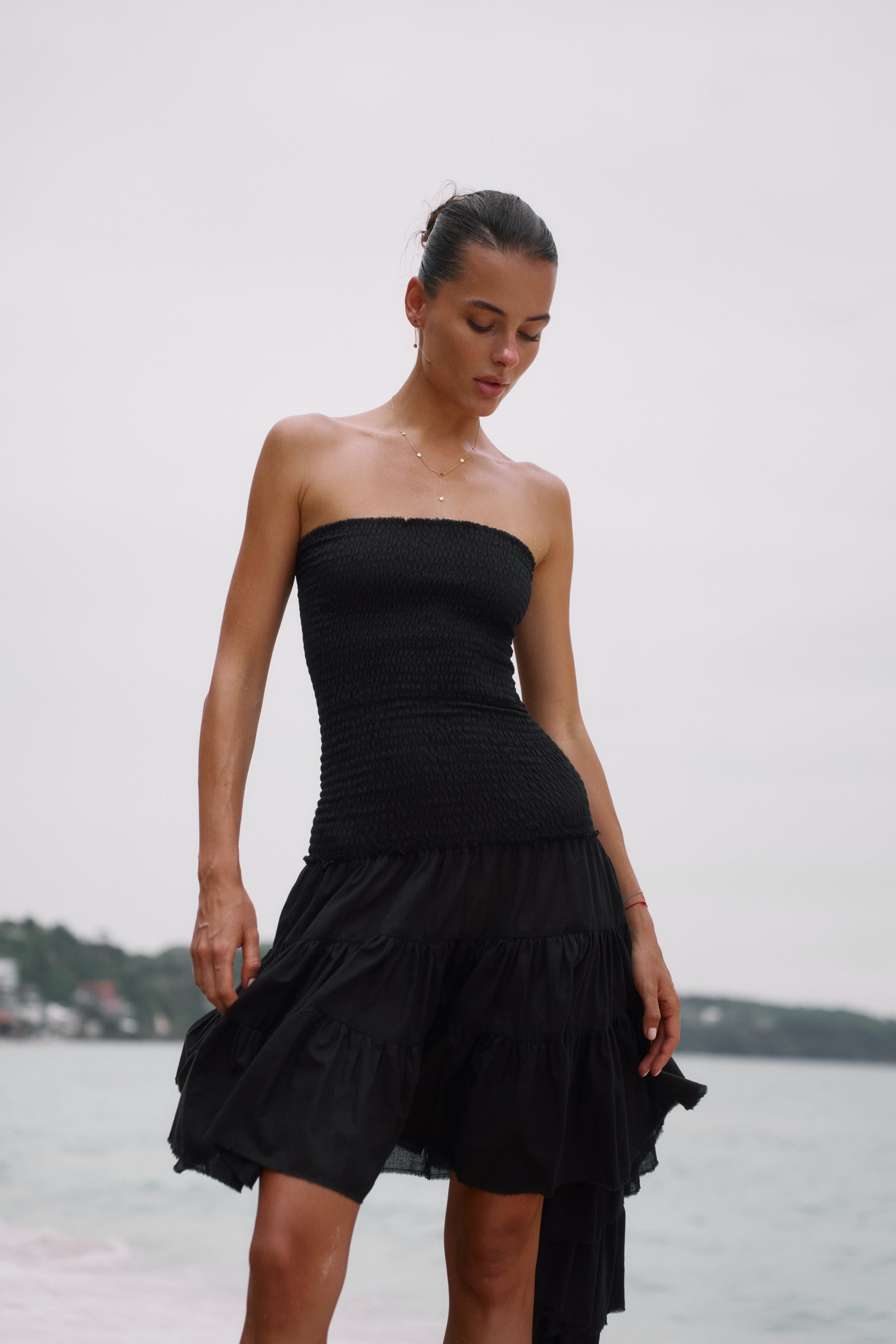 The Maira dress is your go-to for bold simplicity and effortless elegance. Its smocked bodice embraces your silhouette, while the asymmetrical tiered hem flows with every step.